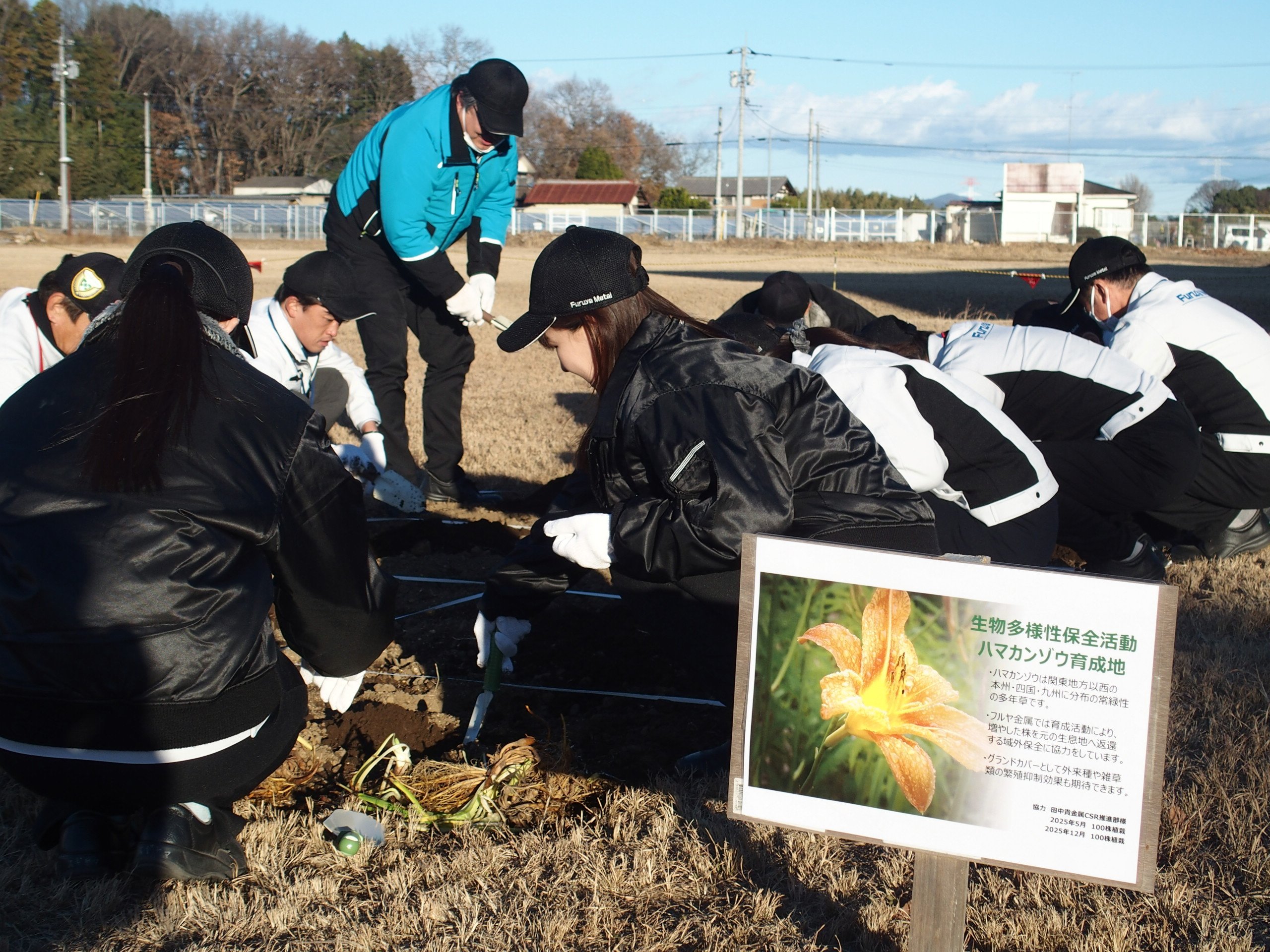 株式会社フルヤ金属(本社:東京都豊島区、社長:古屋堯民、以下「当社」)は、2025年12月15日(月)に茨城県筑西市のつくば工場にて、ハマカンゾウ110株の追加植栽を実施しました。本追加植栽は、当社のサスティナビリティ活動の一環として、NPO法人小網代野外活動調整会議(神奈川県三浦市、代表:岸由二、以下「小網代野外活動調整会議」)が行う「小網代の森ハマカンゾウプロジェクト」へ賛同し、実施している生物多様性の保全に向けた活動です。